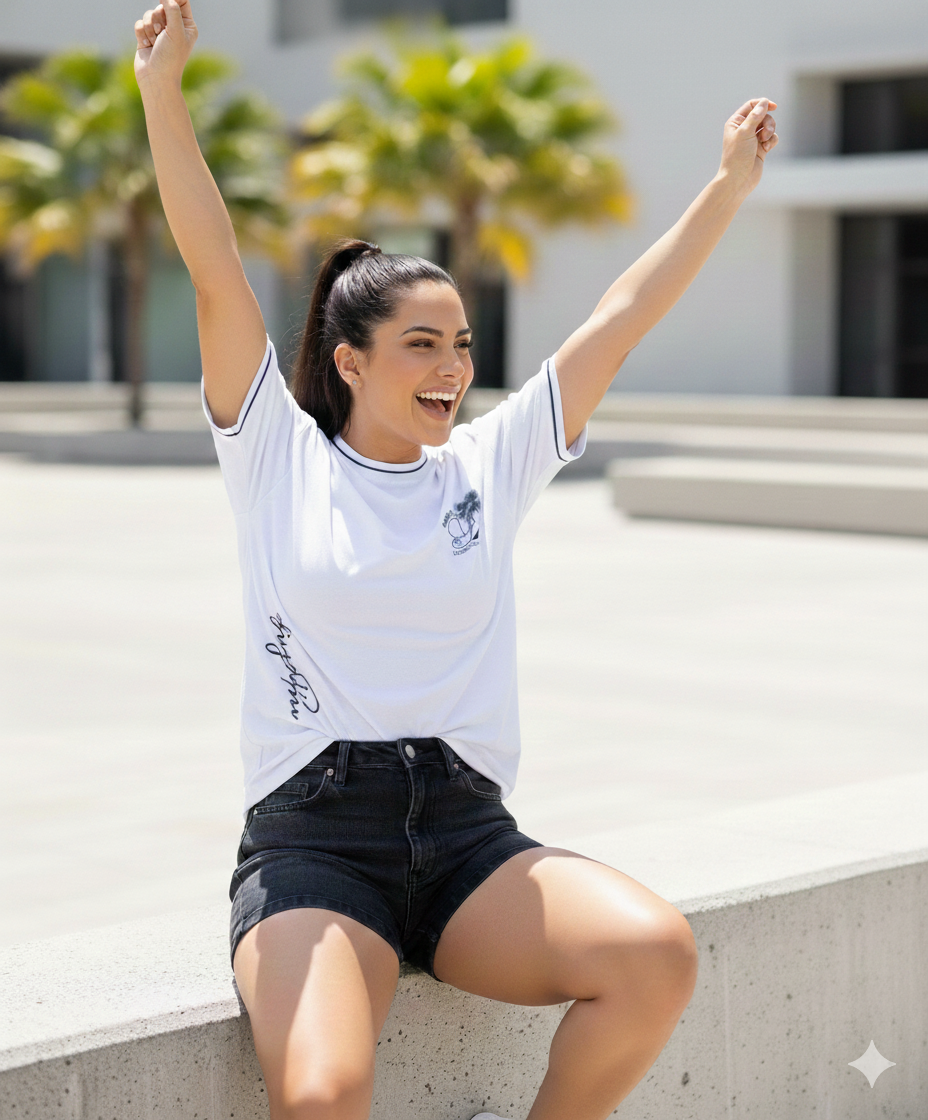 Los detalles en el cuello y mangas elevan la pieza con un acabado deportivo–premium, convirtiéndola en una camiseta versátil para hombres y mujeres que buscan estilo sin esfuerzo.